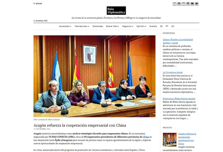 La revista + Iberoamérica, una de las publicaciones económicas de referencia en el ámbito iberoamericano, dedica un amplio reportaje al encuentro empresarial organizado por NI HAO CONECTA (NHC) en Épila (Zaragoza). Más de 80 empresarios chinos visitaron Aragón para conocer su potencial agroalimentario y explorar nuevas oportunidades de colaboración con empresas españolas. El artículo subraya el apoyo institucional, la importancia del diálogo intercultural y el papel de NHC como plataforma que fortalece los lazos económicos entre China y España. Además, destaca la participación del alcalde de Épila y la celebración del 9º aniversario de la Asociación de Cultura y Turismo de China en España durante la jornada.
